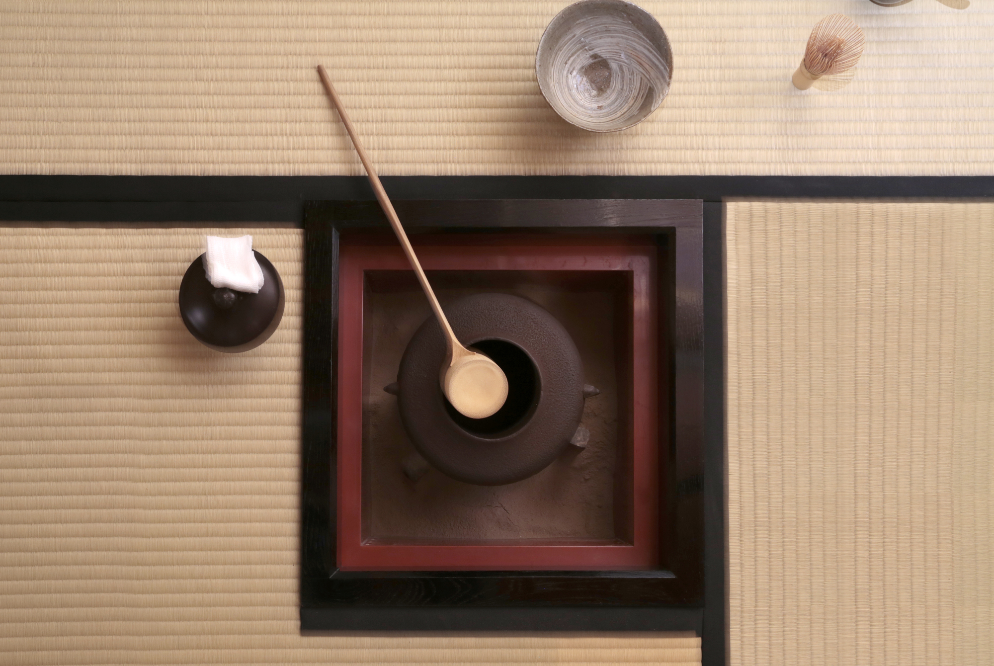 釜は、お茶を点てるお湯を沸かす道具で、茶事・茶会の中心です。炉(畳の囲炉裏)は主に11月から4月の寒い時期に、風炉は5月から10月の暖かい時期に使われます。炉と風炉の使い分けは、茶道が「季節との調和」を重んじる文化であることを象徴しています。